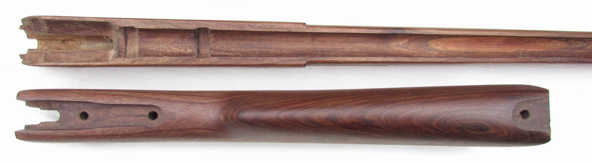 This gunstock is made from walnut wood.
