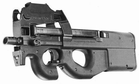 FN P90 to belgijski pistolet maszynowy skonstruowany na początku lat 90-tych. Broń działa na zasadzie odrzutu zamka swobodnego, strzelanie następuje z zamka zamkniętego, po wystrzeleniu z magazynka ostatniego naboju zamek zatrzymuje się w tylnym położeniu. FN P90 został skonstruowany w układzie bezkolbowym (bull pup), co ciekawe okno wylotowe łusek znajduje się na dole broni. Pudełkowy magazynek dwurzędowy na 50 naboi został umieszczony poziomo nad bronią, gniazdo magazynka znajduje się z tyłu broni. FN P90 strzela małokalibrowym nabojem pistoletowym 5,7x28mm, nabój ten posiada bardzo dużą przebijalność. Zastosowano mechanizm spustowy z przełącznikiem rodzaju ognia, dźwignia przełącznika rodzaju ognia pełniąca funkcję bezpiecznika pozwala na strzelanie ogniem pojedynczym i ciągłym. Odmiana cywilna PS90 strzela tylko ogniem pojedynczym. Konstrukcja została w dużej części wykonana z tworzywa sztucznego. Lufa została zakończona tłumikiem płomieni, możliwy jest montaż tłumika dźwięku, aby w pełni wykorzystać możliwości tłumika dźwięku należy strzelać amunicją poddźwiękową. Broń posiada standardowo zamontowany celownik kalimatorowy, celownik został umieszczony nad magazynkiem na specjalnym wsporniku. W odmianie FN P90 Triple Rail montaż osprzętu został ułatwiony dzięki uniwersalnej szynie montażowej Picatinny znajdującej się na wsporniku. Tak więc pistolet maszynowy FN P90 jest bardzo dobrą, nowoczesną i ergonomiczną bronią, która mimo swoich zalet nie zdobyła dużej popularności, odpowiednikiem FN P90 jest niemiecki MP-7.